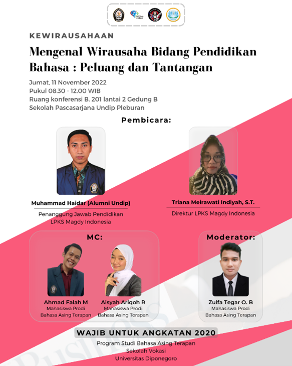 Mengeksplorasi Kewirausahaan Bidang Pendidikan Bahasa Jumat, 11 November 2022 telah dilaksanakan kuliah umum secara tatap muka yang menghadirkan para pemateri handal, yaitu Ibu Triana Meirawati Indiyah, S.T., Direktur Lembaga Pelatihan