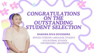 Shakira Diva Dovendra, mahasiswa Bahasa Asing Terapan semester 6, berhasil mendapat peringkat 1 dalam pemilihan Mahasiswa Berprestasi Sekolah Vokasi 2024. Kegiatan Pemilihan Mahasiswa Berprestasi (Pilmapres)