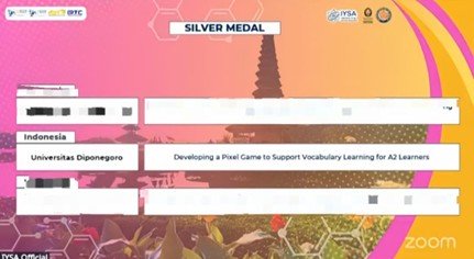 Pada kesempatan ini, enam mahasiswa Bahasa Asing Terapan, yakni Rozan Haidar Ghufron, La’viera Meland Athaya, Ashri Amalia Khairani, Nafisa Naila Rahmah, Irfan Teguh Wibowo, dan Ricken Great Emerald Samani, memilih kategori Education dengan judul Developing a Pixel Game to Support Vocabulary Learning for A2 Learners.
