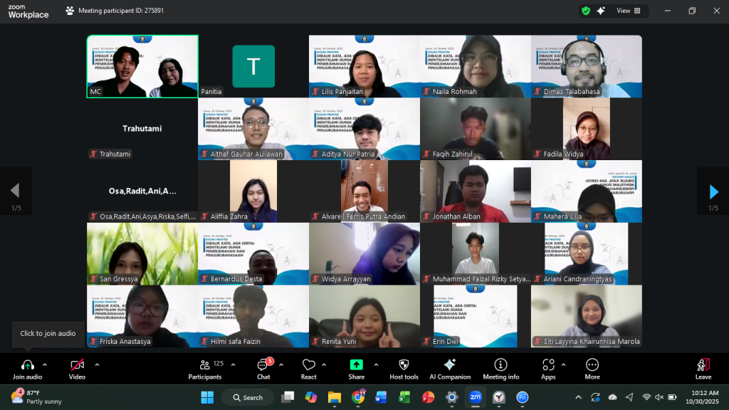 Dalam pemaparannya, narasumber menekankan pentingnya menjadi industry-ready, yaitu memiliki kompetensi teknis, memahami kebutuhan pasar, serta terus belajar dari pengalaman proyek. Ia juga menjelaskan berbagai jalur karier, seperti penerjemah lepas, penerjemah atau jurubahasa in-house, dan pemilik agensi. Strategi menemukan klien pertama melalui jejaring dan sertifikasi turut menjadi sorotan. Selain itu, beliau memaparkan peluang bisnis penerjemahan dan penjurubahasaan di berbagai sektor, sekaligus menegaskan pentingnya mengenali pasar dan menentukan niche layanan. Sesi ditutup dengan pesan inspiratif: “Penerjemahan adalah kunci industri global, banggalah dengan profesimu dan jaga integritas bidang kita.”