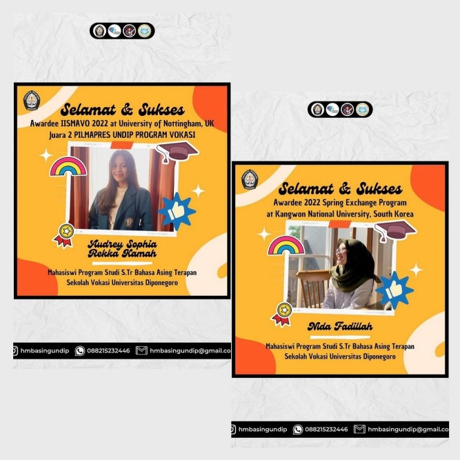 We hope that Audrey and Nida’s achievement can inspire their fellow students to experience overseas education. Studying abroad is not only a matter of experiencing a different style of education, but also to enhance students’ intercultural communication and people-to-people connection among nations. Universitas Diponegoro has supported its students to experience international outbound mobility programs through various programs. Students can also find relevant information from the IO in their respective faculties.