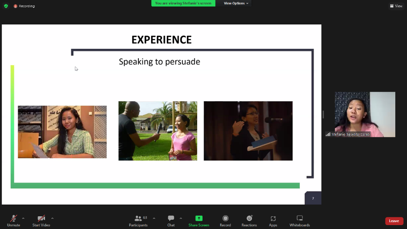 Dalam sesi ini, Ms. Stefanie berbagi tentang public speaking berdasarkan pengalamannya. Dia mengatakan bahwa, berbicara di depan umum adalah berbicara langsung kepada orang-orang dan berkomunikasi secara efektif