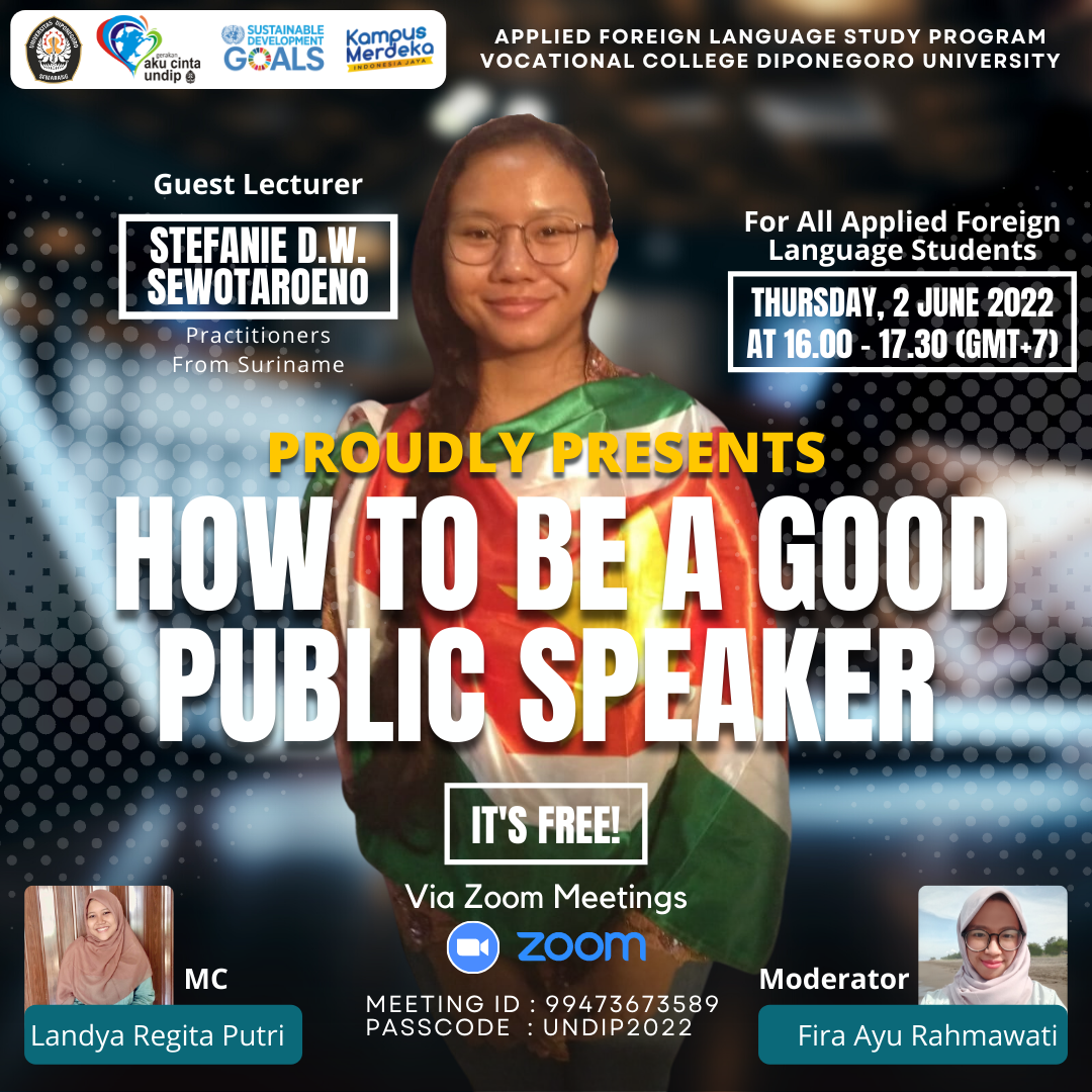Pada hari Kamis tanggal 2 Mei 2022 telah diadakan webinar untuk seluruh mahasiswa D4 Terapan Bahasa Asing Universitas Diponegoro. Webinar ini bertujuan untuk memberikan wawasan tentang bagaimana menjadi pembicara yang baik. Webinar ini menghadirkan seorang pembicara yang sudah berpengalaman dalam bidang public speaking yaitu Ms. Stefanie Sewotaroeno dari Suriname. Dalam kegiatan ini, Kak Landya Putri bertugas sebagai pembawa acara dan Kak Fira Ayu bertugas sebagai moderator. Mereka adalah mahasiswa D4 – Terapan Bahasa Asing angkatan 2020.