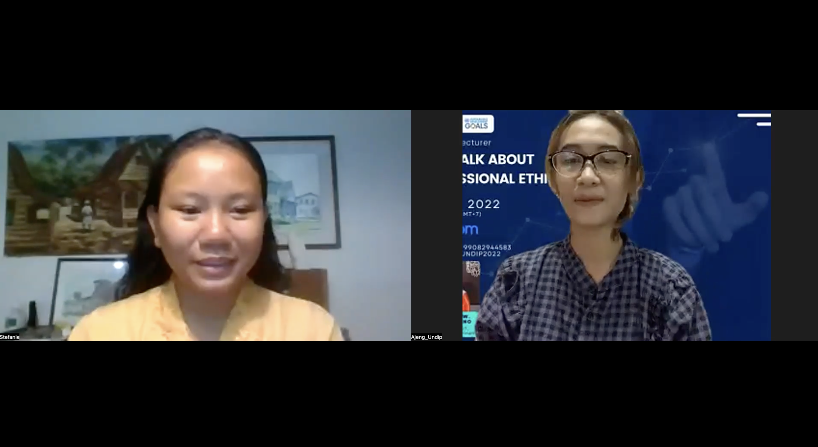 Pada hari Kamis, 19 Mei 2022, Ms. Stefanie D.W. Sewotaroeno, seorang analis di Futureproof Besloten Vennootschap Belanda yang berasal dari Suriname hadir sebagai dosen tamu untuk memberikan pemaparan kepada seluruh mahasiswa D4 – Bahasa Asing Terapan, Universitas Diponegoro mengenai pengetahuan terkait dengan Professional Ethics. Kegiatan Guest Lecturer yang diselenggarakan melalui platform Zoom. Kegiatan ini dimoderatori oleh Kak Ajeng Noer Olivia yang merupakan mahasiswi D4 – Bahasa Asing Terapan angkatan 2019.