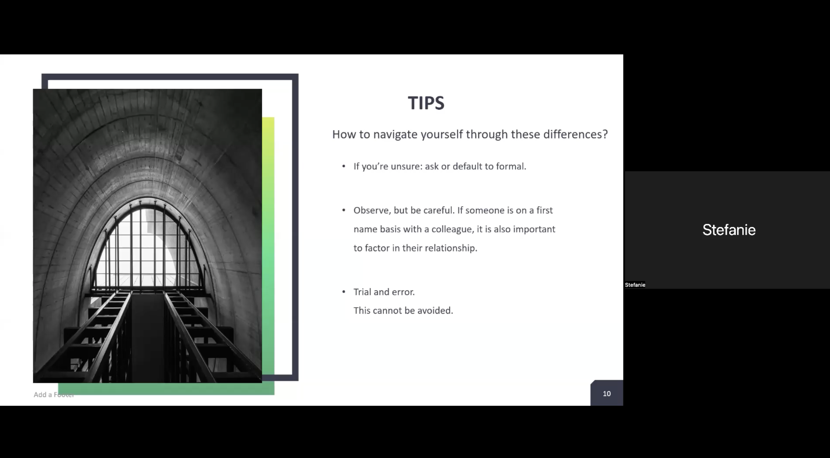 Apa saja tips dalam menavigasi diri di suatu perusahaan? Beberapa di antaranya adalah memahami kode etik karyawan melalui buku pedoman, tidak sungkan dalam mengajukan pertanyaan, pentingnya mengamati dan memperhatikan, dan jangan takut menjadi diri sendiri. Ms. Stefanie berbagi pengalamannya dalam menavigasi diri melalaui perbedaan dalam penyebutan panggilan rekan kerja dapat dilakukan. Hal ini dia lakukan dengan bertanya kepada rekan atau memulai dengan panggilan yang cenderung formal. Perhatikan jika menemukan seseorang menggunakan panggilan nama depan dengan rekan kerja maka penting untuk mempertimbangkan hubungan mereka, dan tips yang terakhir adalah trial and error, hal ini tidak bisa dihindari