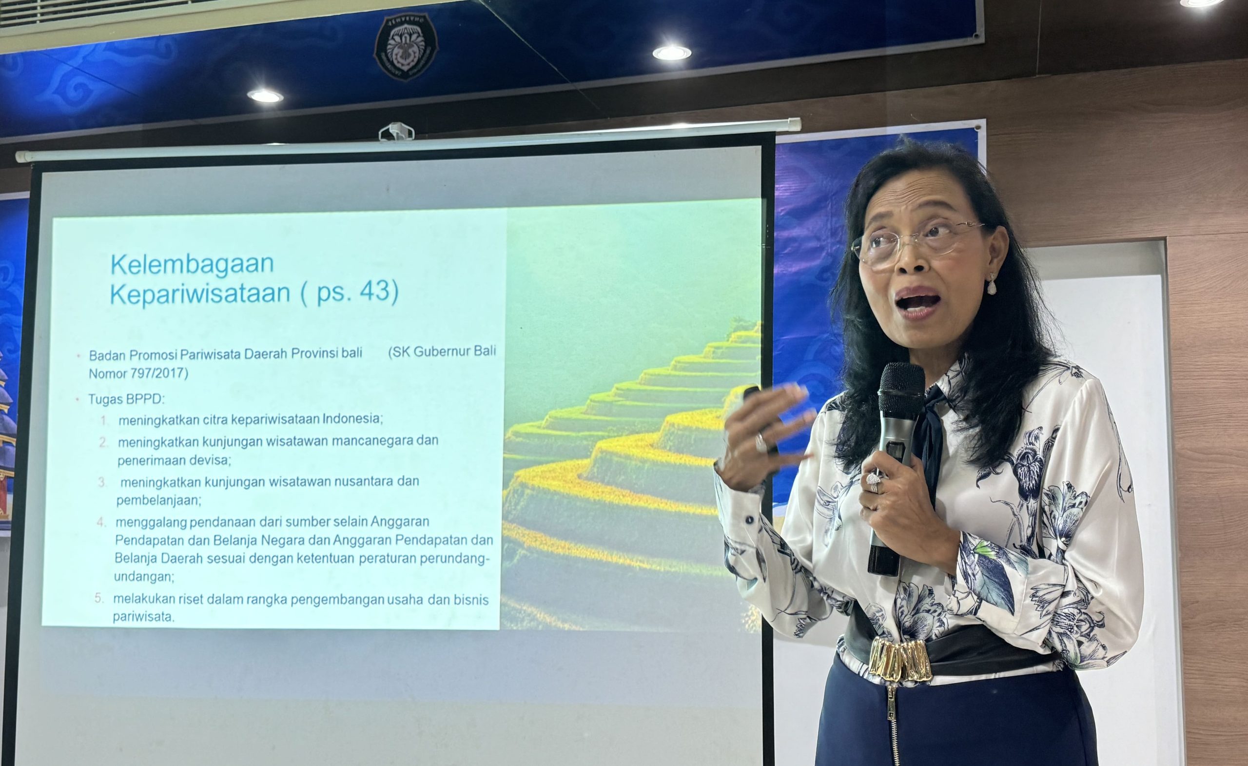 Dalam kesempatan ini, Bu Putu berbagi kepada mahasiswa tentang pemasaran pariwisata Pulau Bali. Beliau menyampaikan tentang fakta-fakta pemasaran pariwisata Bali. Sebagai provinsi yang bergantung pada sektor pariwisata, Bali harus dapat melakukan branding yang tepat untuk menyasar segmen pasar yang sesuai. Adapun branding yang telah ditetapkan adalah Bali sebagai Pulau Dewata atau Island of Gods.