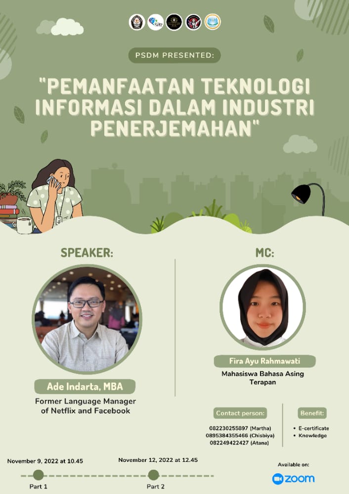 Mahasiswa program studi Bahasa Asing Terapan angkatan 2020 mengikuti kegiatan kuliah tamu pada hari Rabu, 9 November 2022. Kuliah tamu ini diadakan dalam dua pertemuan. Pertemuan pertama kuliah tamu ini mengusung tema “Pemanfaatan Teknologi Informasi Dalam Industri Penerjamahan”.
