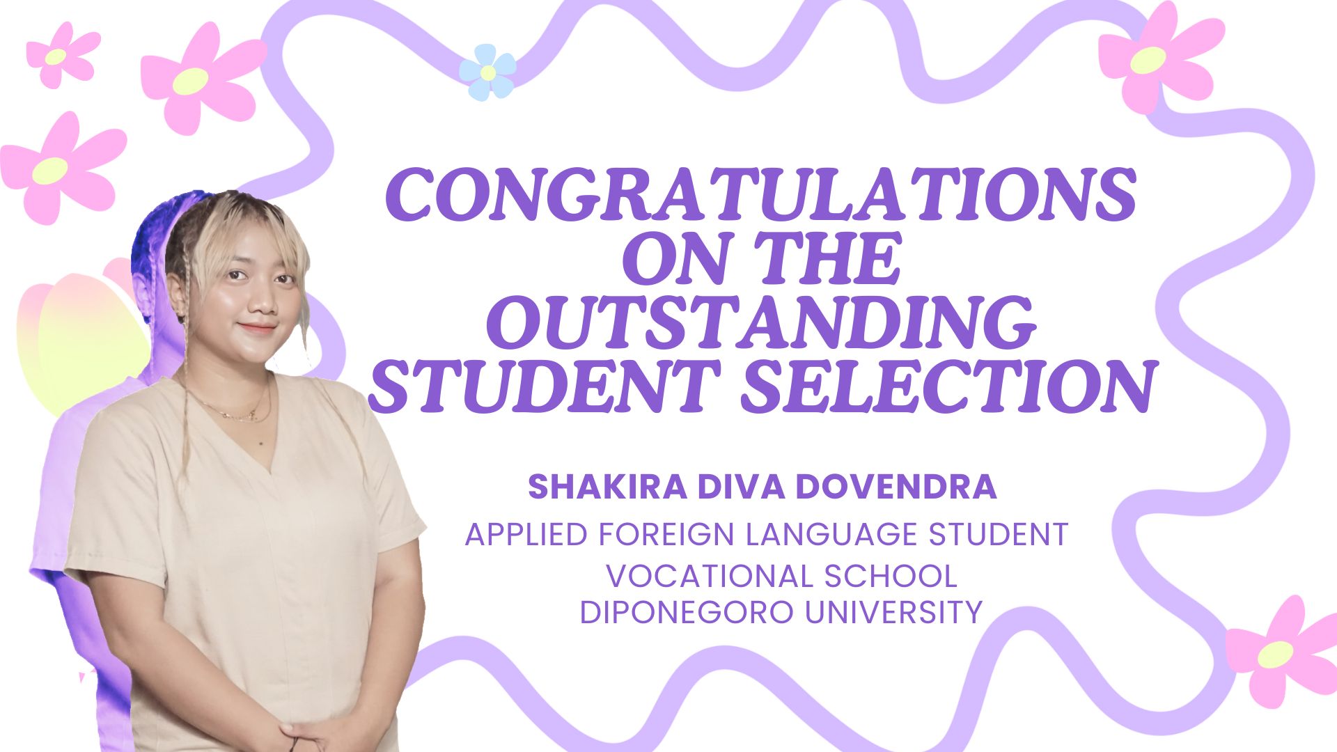 Shakira Diva Dovendra, mahasiswa Bahasa Asing Terapan semester 6, berhasil mendapat peringkat 1 dalam pemilihan Mahasiswa Berprestasi Sekolah Vokasi 2024. Kegiatan Pemilihan Mahasiswa Berprestasi (Pilmapres) berlansung pada 23 Februari 2024.